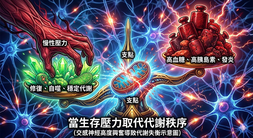 胰島素阻抗在壓力情境下,其實是身體的一種**「能量重分配」策略**。身體透過讓外周組織(如脂肪、肌肉)產生阻抗,將葡萄糖優先留給神經系統。然而,當戰爭永不結束(慢性壓力),這種臨時的配給制度便演變為長期的代謝暴政。粒線體在這種高壓、高糖、高胰島素的環境下,失去了原本的平靜運作軌律,陷入了熱力學上的混亂。