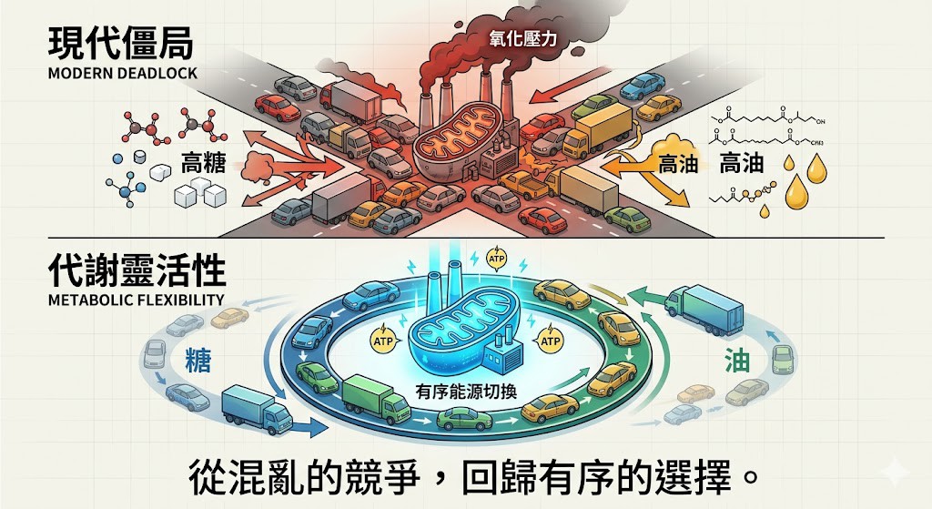 二、 生物哲學:代謝靈活性的喪失從生物哲學的角度看,蘭得爾循環本是為了在飢餓時保存葡萄糖供給大腦、在飽足時優先利用葡萄糖的生存智慧。 代謝症候群的本質,在於蘭得爾循環被「鎖定」在脂肪氧化與高血糖並存的矛盾狀態。 現代飲食中,高脂肪與高碳水化合物同時存在(高胰島素背景下的過度能源),導致蘭得爾循環陷入「僵局」。細胞被過載的燃料淹沒,粒線體在兩種能源之間反覆掙扎,最終導致代謝靈活性(Metabolic Flexibility)的喪失。這是一種熱力學上的混亂,細胞雖然被燃料包圍,卻因訊號封鎖而無法有效產能。 三、 臨床逆轉:重構燃料順序要破解蘭得爾循環引發的代謝僵局,必須打破底物競爭的惡性循環: